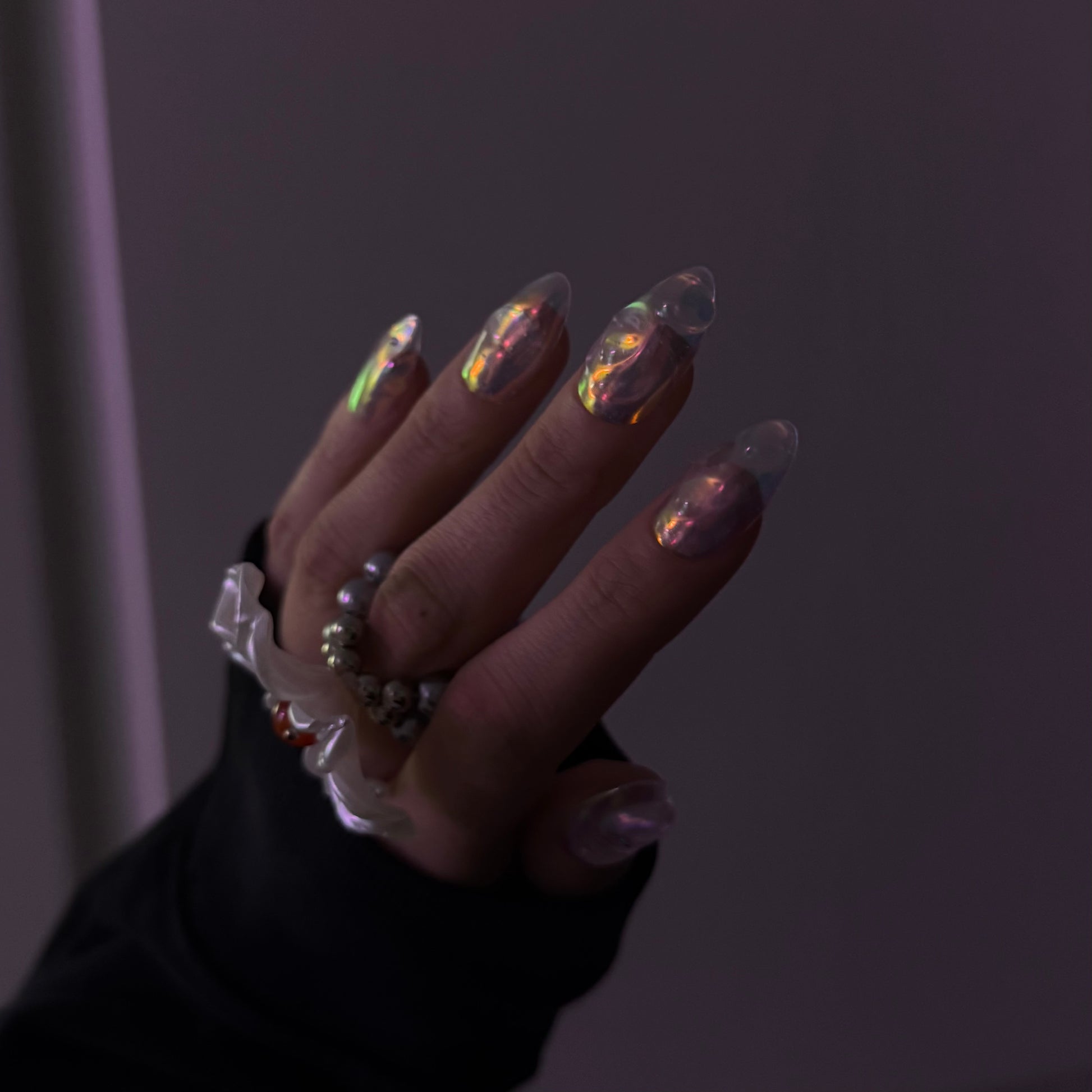Forme et longueur présentée : Amande médium. Ils peuvent se porter avec des gel-pads ou de la colle. Pose réalisé avec uniquement du chrome : le rendu pourra être très différents selon les lumières.