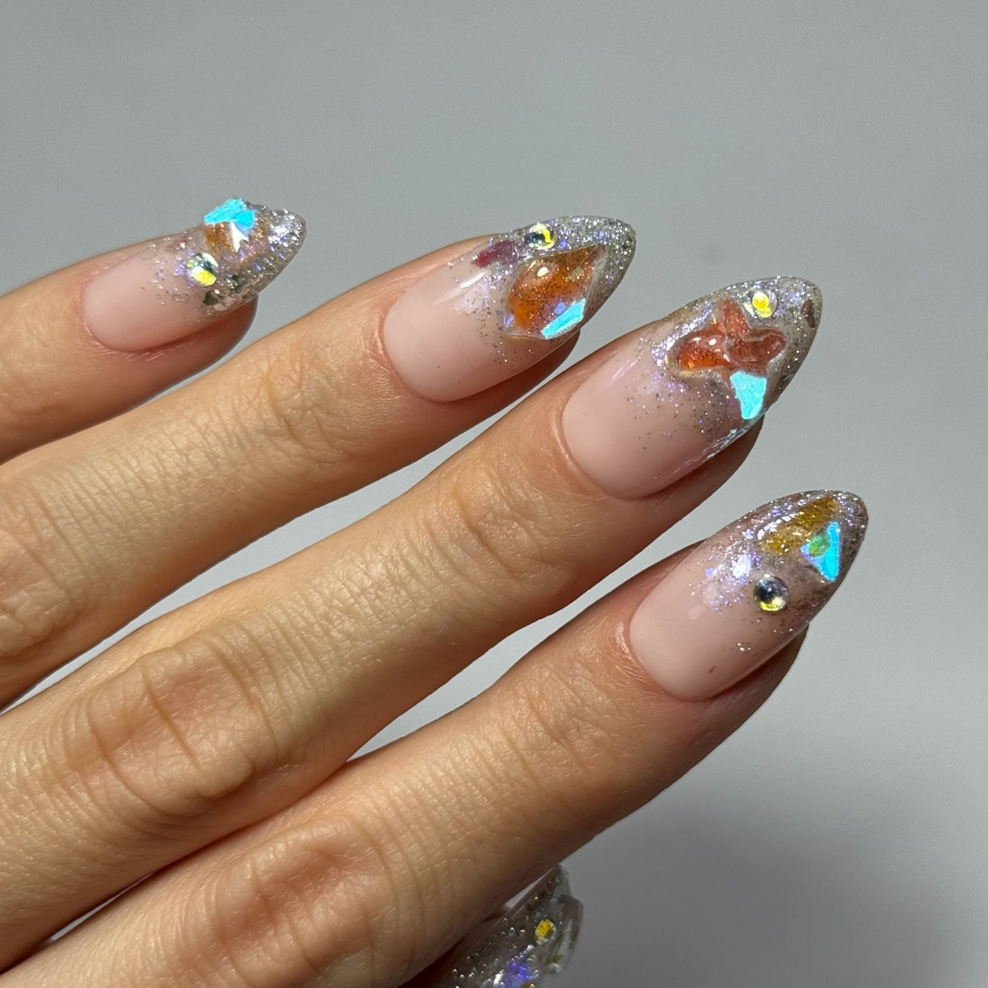 Ces ongles sur base nude sont dégradés de paillettes réfléchissantes et de cristaux aux reflets bleu azur et orange pour un look unique et festif !